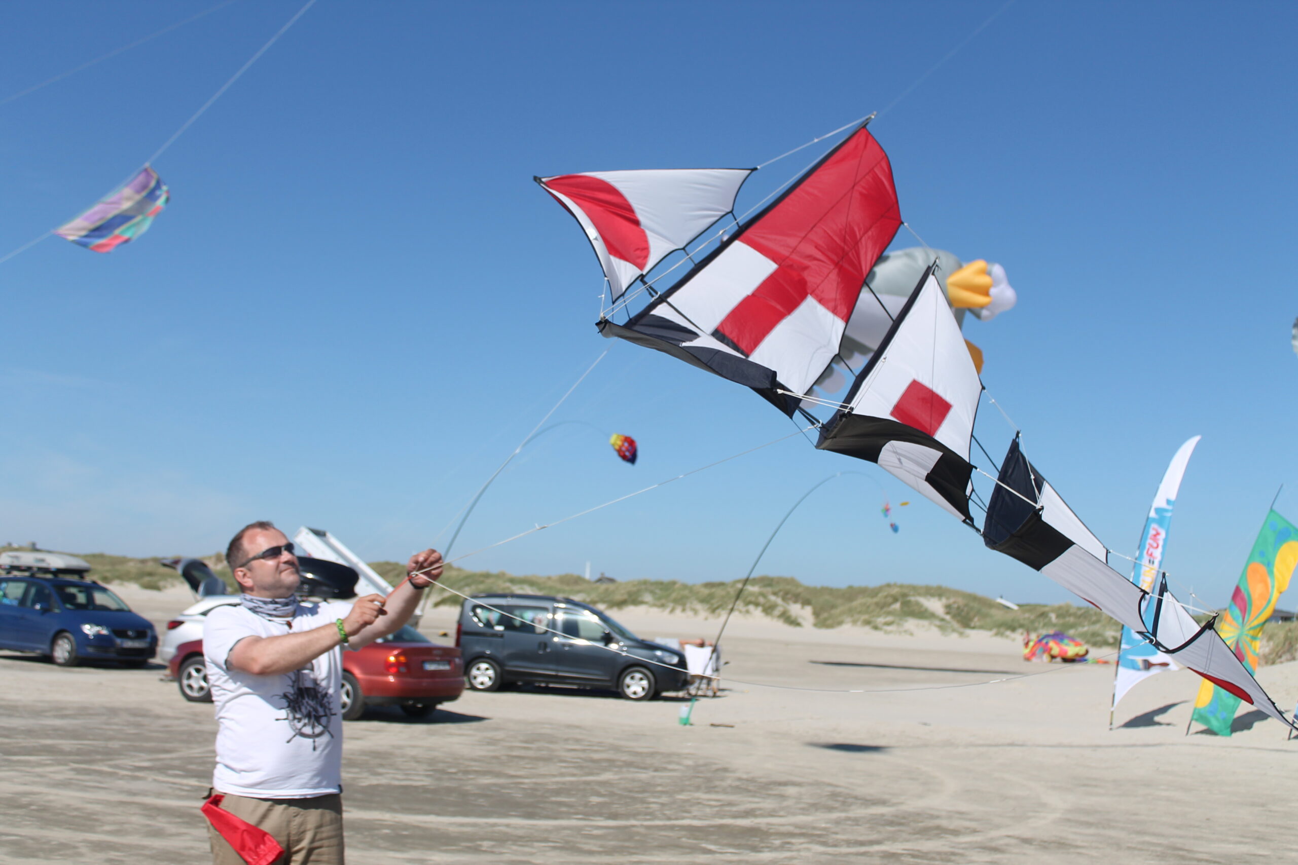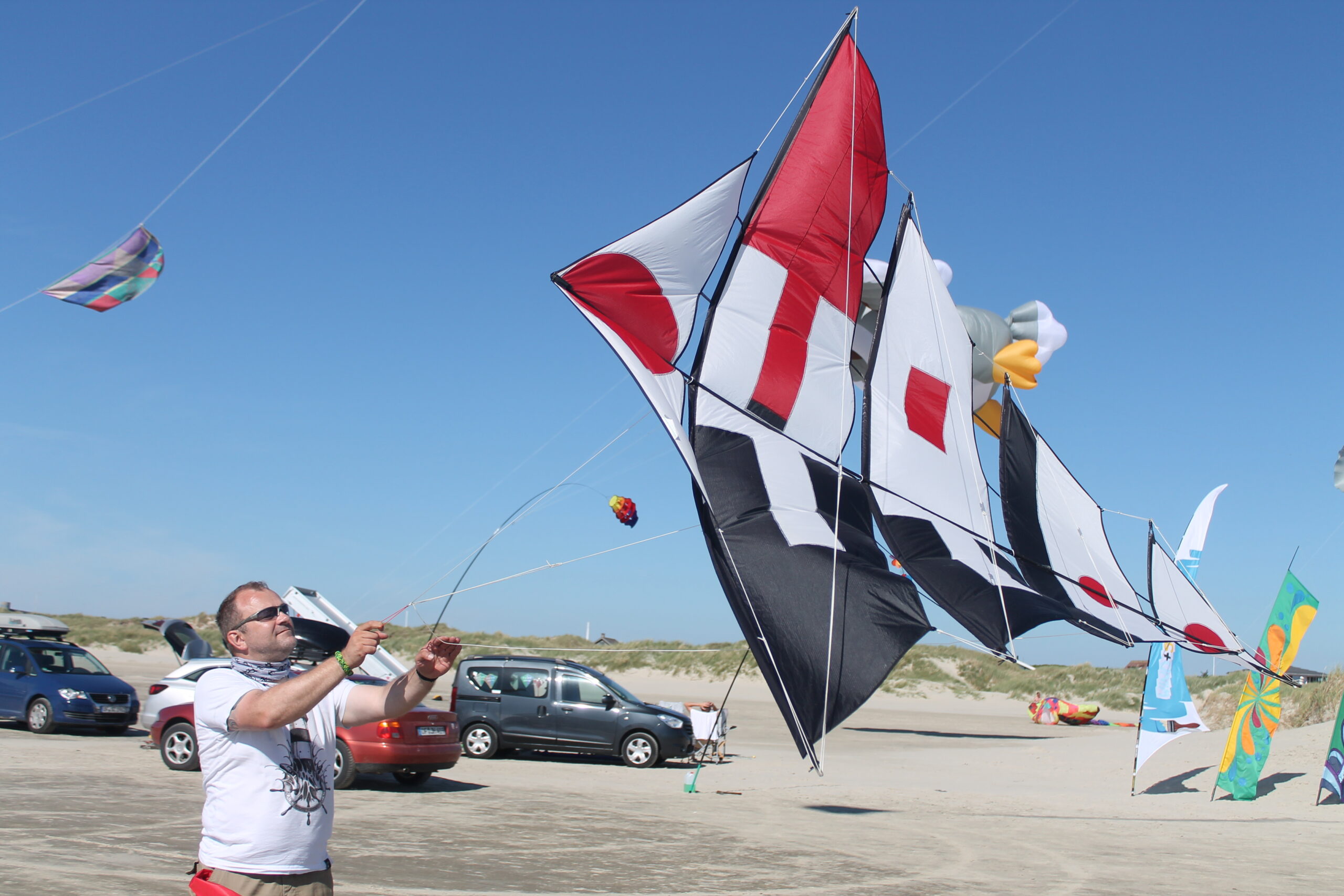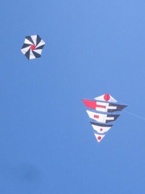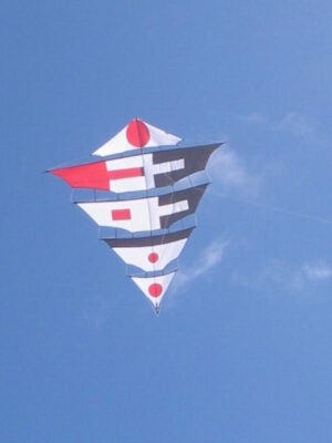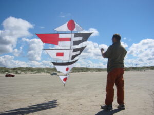 Der Drachen hatte seinen Erstflug 2004 bei meinem dritten (3) Besuch zum Drachenfest auf Fanø. Im Vergleich zum Mezger, benötigt und verträgt dieser durchaus etwas mehr Wind. Allerdings beansprucht er , zumindest anfänglich, etwas mehr Geduld beim Aufbau 😯 .